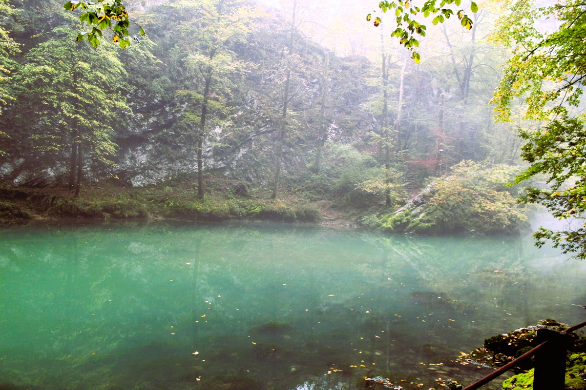 Gospa Tinka nam je najprej pokazala Divje jezero. To sifonsko jezero leži v kamnitem kotlu pod stometrskimi prepadnimi stenami. Voda vanj priteka iz strmega rova, ki so ga raziskali do globine 160m. V celoti bo ta krasen kos narave najbrž za vedno ostal skrivnost.